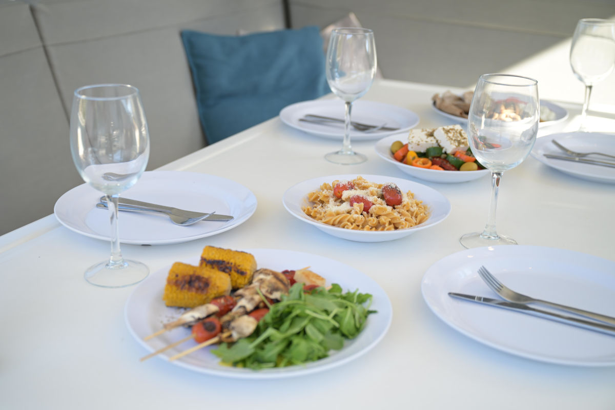 A wholesome Mediterranean meal enjoyed on board with views of the coastline.